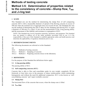 Sets out the method for determining the slump flow of self compacting concrete (SCC) with a measurable diameter of spread of the flowing concrete in excess of 500 mm when the nominal size of aggregate does not exceed 20 mm.