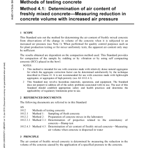 This Standard sets out the method for determining the air content of freshly mixed concrete from observations of the change in volume of the concrete when it is subjected to an increased air pressure.