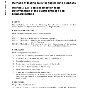 This Standard sets out a method for determining the plastic limit of a soil (the moisture content at which a soil passes from the semi-solid to the plastic state).