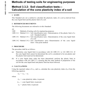 This Standard sets out a method to calculate the plasticity index of a soil as derived from the cone liquid limit and the plastic limit of a soil.