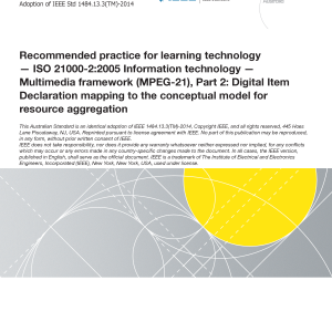 Identically adopts IEEE Std 1484.13.3(TM)—2014 which specifies how the elements and attributes defined in ISO/IEC 21000 2, Information technology — Multimedia framework (MPEG-21) — Part 2: Digital Item Declaration relate to the components of the conceptual model for resource aggregation defined in AS IEEE 1484.13.1.KEYWORDS: Resource aggregation; MPEG 21; Digital Item Declaration