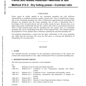 This Standard describes procedures for the quantitative determination of the opacity (by contrast ratio measurement) of a dry, light-coloured paint film at a specified spreading rate. Content history AS 1580.213.2-1992 [Superseded] Please select a variation to view its description. Published 01/01/2004 Pages 5 Please select a variation to view its pdf.