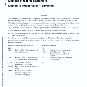 Home/AS/AS 1683.1-2002 🔍Purchase the full subscription package now and enjoy a 40% discount, along with free updates for future editions. AS 1683.1-2002$109.95 Methods of test for elastomers, Method 1: Rubber latex — Sampling AS 1683.1-2002 quantity Add to cart PDF Format Searchable Printable Preview Now Description Edition Details Additional information Preview PDF Specifies procedures for sampling natural rubber latex and for sampling synthetic rubber latices and artificial latices. This Standard is identical with and has been reproduced from ISO 123:2001. Content history ISO 123:2001 [Current] AS 1683.1-1974 [Superseded] ISO 123-2001 Please select a variation to view its description. Published 01/01/2002 Pages 8 Please select a variation to view its pdf. Related products AS/NZS 5263.1.7:2016 $113.69 Add to cart AS 5250:2024 $63.00 Add to cart AS 2341.6-1992 $28.78 Add to cart AS/NZS 1462.8:2008 $63.00 Add to cart