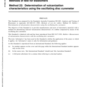 Home/AS/AS 1683.22-2001 🔍Purchase the full subscription package now and enjoy a 40% discount, along with free updates for future editions. AS 1683.22-2001$61.46 Methods of test for rubber, Method 22: Determination of vulcanization characteristics using the oscillating disc curemeter AS 1683.22-2001 quantity Add to cart PDF Format Searchable Printable Preview Now Description Edition Details Additional information Preview PDF Specifies a method for determining selected vulcanizing characteristics of a rubber compound by means of the oscillating disc curemeter. This Standard is identical with and has been reproduced from ISO 3417:1991. Content history ISO 3417:1991 [Superseded] AS 1683.22-1983 [Superseded] ISO 3417-1991 Please select a variation to view its description. Published 01/01/2001 Pages 12 Please select a variation to view its pdf. Related products AS 1189.7-1982 $100.10 Add to cart AS 3570-1998 $125.14 Add to cart AS (E)D641-1941 $87.96 Add to cart AS 5101.3.2-2008 $50.39 Add to cart