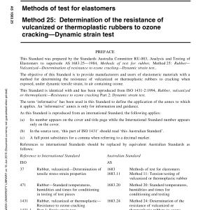Home/AS/AS 1683.25-2001 🔍Purchase the full subscription package now and enjoy a 40% discount, along with free updates for future editions. AS 1683.25-2001$85.55 Methods of test for rubber, Method 25: Determination of the resistance of vulcanized or thermoplastic rubbers to ozone cracking — Dynamic strain test AS 1683.25-2001 quantity Add to cart PDF Format Searchable Printable Preview Now Description Edition Details Additional information Preview PDF Specifies a method to estimate the resistance of vulcanized or thermoplastic rubbers to cracking when exposed, under static tensile strain, to air containing ozone. This Standard is identical with and has been reproduced from ISO 1431-2:1994. Content history ISO 1431-2:1994 [Superseded] AS 1683.25-1984 [Superseded] ISO 1431-2-1994 Please select a variation to view its description. Published 01/01/2001 Pages 8 Please select a variation to view its pdf. Related products AS/NZS 1462.8:2008 $63.00 Add to cart AS 2341.6-1992 $28.78 Add to cart AS 1189.7-1982 $100.10 Add to cart AS 5101.3.2-2008 $50.39 Add to cart