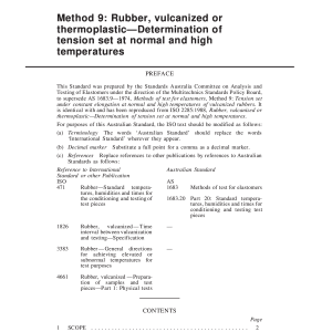 Specifies a method for determining the tension set characteristics of vulcanized or thermoplastic rubbers. Apparatus, dimensions, preparation, conditioning, marking, and time-interval between vulcanization and testing of test pieces, procedure, strain, duration of test and temperature, expression of results and test report are laid down. This Standard is identical with and reproduced from ISO 2285:1988.