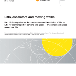AS 1735.1.2:2021 identically adopts EN 81 20:2020 for Australia which specifies the safety rules for permanently installed new passenger or goods passenger lifts, with traction, positive or hydraulic drive, serving defined landing levels, having a car designed for the transportation of persons or persons and goods, suspended by ropes, chains or jacks and moving between guide rails inclined not more than 15° to the vertical.