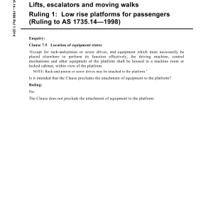 Home/AS/AS 1735.14-1998 Rul 1:2014 🔍Purchase the full subscription package now and enjoy a 40% discount, along with free updates for future editions. AS 1735.14-1998 Rul 1:2014 Lifts, escalators and moving walks, Part 14: Low rise platform for passengers (Ruling to AS 1735.14-1998) Description Edition Details Additional information Preview PDF Sets out Rulings to AS 1735.14-1998, which provide interpretations to specific enquiries that have a wide area of practical application but are generally not suitable for inclusion in the Standard. Table of contents Cited references in this standard Content history AS 1735.14-1998 [Pending Revision] Please select a variation to view its description. Published 27/11/2014 Pages 1 Please select a variation to view its pdf. Related products AS/NZS 5263.1.7:2016 $113.69 Add to cart AS 5250:2024 $63.00 Add to cart AS/NZS 3837:1998 $125.14 Add to cart AS 2205.6.1-1988 $50.39 Add to cart