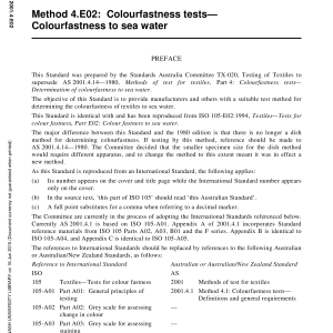 Specifies a method for determining colourfastness to immersion in seawater. Two methods are described as alternatives for drying the wetted specimen prior to assessment. This Standard is identical with and has been reproduced from ISO 105-E02:1994. Content history ISO 105-E02:1994 [Superseded] AS 2001.4.14-1980 [Superseded] AS 2001.4.E02-2001 Rec:2016 Please select a variation to view its description. Published 06/06/2001 Pages 3 Please select a variation to view its pdf.