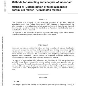 Sets out requirements for a method for the sample collection and gravimetric analysis of suspended particles in indoor air. Suspended particles are emitted from indoor air from a number of sources, including cigarette smoke, food cooking and space heating.