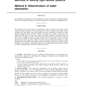 Specifies a method for determining the water absorption of rigid cellular plastics by measuring the change in buoyant force resulting from immersion in distilled water.