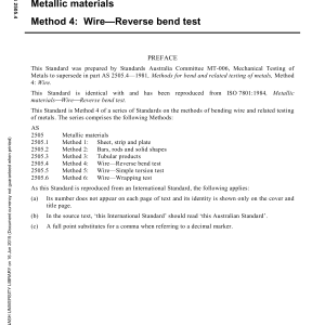 Specifies a method for determining the ability of metallic wire of diameter or thickness 0.3 to 10 mm inclusive to undergo plastic deformation during reverse bending. This Standard is identical with and has been reproduced from ISO 7801:1984.