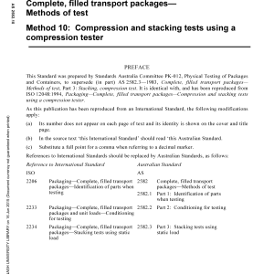 Sets out a method for testing the resistance of complete, filled transport packages to compression using a compression tester, and a method for carrying out a stacking test on complete, filled transport packages using the same apparatus. Identical with and reproduced from ISO 12048:1994.