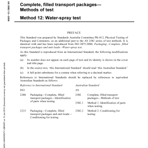 Home/AS/AS 2582.12-2006 🔍Purchase the full subscription package now and enjoy a 40% discount, along with free updates for future editions. AS 2582.12-2006$87.70 Complete, filled transport packages, Method 12: Methods of test — Water-spray test AS 2582.12-2006 quantity Add to cart PDF Format Searchable Printable Preview Now Description Edition Details Additional information Preview PDF This International Standard specifies a method for testing the resistance of a complete, filled transport package or a unit load to water spray or the protection it gives to its contents from water spray. Content history ISO 2875:2000 [Current] ISO 2875-2000 Please select a variation to view its description. Published 10/07/2006 Pages 5 Please select a variation to view its pdf. Related products AS 2400.13-1983 $63.00 Add to cart AS 5101.3.2-2008 $50.39 Add to cart AS (E)D641-1941 $87.96 Add to cart AS 1189.7-1982 $100.10 Add to cart