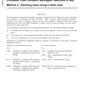 Provides a method for testing complete, filled transport packages, using a static load, in order to assess their performance in terms of strength and protection of their contents. Identical with and reproduced from ISO 2234:2000.