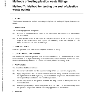 This Standard sets out the method for testing the hydrostatic sealing ability of plastics waste outlets.