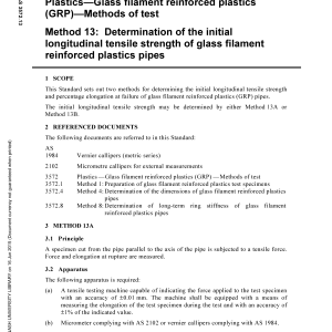 This Standard sets out two methods for determining the initial longitudinal tensile strength and percentage elongation at failure of glass filament reinforced plastics (GRP) pipes. Content history AS 3572.13-1989 [Superseded] Please select a variation to view its description. Published 01/01/2002 Pages 5 Please select a variation to view its pdf.