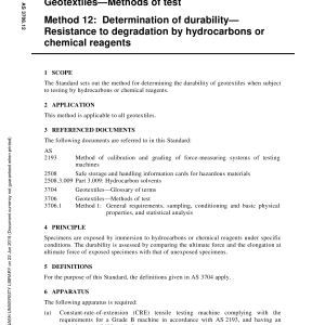 The Standard sets out the method for determining the durability of geotextiles when subject to testing by hydrocarbons or chemical reagents.