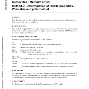 This Standard sets out the method for determining the tensile properties of geotextiles in both atmospheric and wet conditions.