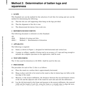 Home/AS/AS 4046.2-2002 🔍Purchase the full subscription package now and enjoy a 40% discount, along with free updates for future editions. AS 4046.2-2002$47.81 Methods of testing roof tiles, Method 2: Determination of batten lugs and squareness AS 4046.2-2002 quantity Add to cart PDF Format Searchable Printable Preview Now Description Edition Details Additional information Preview PDF This Standard sets out the method for the selection of roof tiles for testing and sets out the method for determining that the tiles are self-supporting when hung on the lugs provided and the alignment of the tile is true. Table of contents Header About this publication 1 Scope 2 Referenced documents 3 Apparatus 4 Test specimens 5 Procedure 6 Records 7 Report Cited references in this standard Content history AS 4046.2-1992 [Superseded] DR 02042 AS 4046.2-2002 REC:2020 Please select a variation to view its description. Published 30/10/2002 Pages 3 Please select a variation to view its pdf. Related products AS 1038.10.3-1998 $47.81 Add to cart AS 1716-1991 $213.50 Add to cart AS 2331.3.10-2001 $47.81 Add to cart AS 1099.3.7-1981 $28.78 Add to cart
