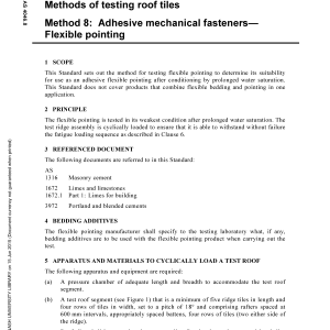Home/AS/AS 4046.8-2006 🔍Purchase the full subscription package now and enjoy a 40% discount, along with free updates for future editions. AS 4046.8-2006$47.81 Methods of testing roof tiles, Method 8: Adhesive mechanical fasteners — Flexible pointing AS 4046.8-2006 quantity Add to cart PDF Format Searchable Printable Preview Now Description Edition Details Additional information Preview PDF This Standard sets out the method for testing flexible pointing to determine its suitability for use as an adhesive flexible pointing after conditioning by prolonged water saturation. Content history AS 4046.8:2015 [Current] AS 4046.8-2002 [Superseded] Please select a variation to view its description. Published 31/01/2006 Pages 3 Please select a variation to view its pdf. Related products AS 2400.13-1983 $63.00 Add to cart AS 1603.2-1990 $70.15 Add to cart AS 1099.3.7-1981 $28.78 Add to cart AS 1189.7-1982 $100.10 Add to cart