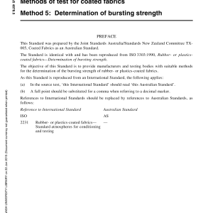 Specifies the methods for the determination of the bursting strength of coated fabrics. This Standard is identical with and has been reproduced from ISO 3303:1990. Content history ISO 3303:1990 [Superseded] Please select a variation to view its description. Published 25/10/2001 Pages 3 Please select a variation to view its pdf.