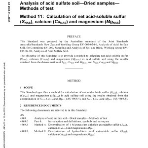 This Standard specifies a method for calculation of net acid-soluble sulfur (SNAS), calcium (CaNAS) and magnesium (MgNAS) in acid sulfate soil using the results obtained from the determination of SKCl, CaKCl and MgKCl (AS 4969.4), and SHCl, CaHCl and MgHCl (AS 4969.8).