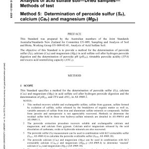 This Standard specifies a method for the determination of peroxide sulfur (SP), calcium (CaP) and magnesium (MgP) in acid sulfate soil after hydrogen peroxide digestion and the determination of pHOX, and TPA and ANCE in AS 4969.3.