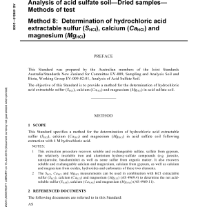 This Standard specifies a method for the determination of hydrochloric acid extractable sulfur (SHCl), calcium (CaHCl) and magnesium (MgHCl) in acid sulfate soil following extraction with 4 M hydrochloric acid.