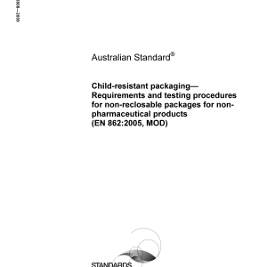 Sets out requirements and testing procedures for non-reclosable child-resistant packaging for non-pharmaceutical products. Reproduced from EN 862:2005 with Australian variations based on a smaller population size.