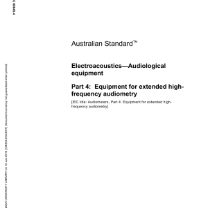 Specifies requirements for audiometric equipment designed for use in pure tone audiometry in the frequency range from 8000 Hz to 16000 Hz. This Standard is identical with and has been reproduced from IEC 60645-4:1994. Content history IEC 60645-4:1994 [Superseded] AS 2586-1983 [Superseded] IEC 60645-4-1994 Please select a variation to view its description. Published 01/01/2002 Pages 6 Please select a variation to view its pdf.