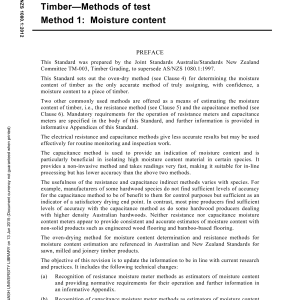 This Standard sets out the oven-drying method for determining the moisture content of specimens cut from solid timber, and the procedure for sampling of timber lots. This Standard also specifies requirements for the methods of estimating the local moisture content of solid timber using resistance meter and capacitance meter.
