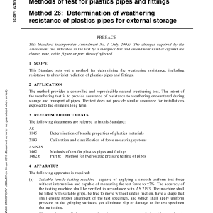This Standard sets out a method for determining the weathering resistance, including resistance to ultraviolet radiation of plastics pipes and fittings.
