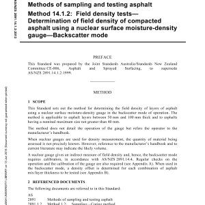 This Standard sets out the method for determining the field density of layers of asphalt using a nuclear surface moisture-density gauge in the backscatter mode of operation. The method is applicable to asphalt layers between 50 mm and 100 mm thick and to asphalts having a nominal maximum size not greater than 40 mm.