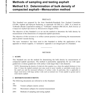 This Standard sets out the method for determining the bulk density by measurement of compacted asphalt specimens. The method is particularly appropriate for use with open-graded mix or dense-graded mix with surface voids larger than 3mm diameter.