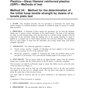 This Standard describes the test procedure to determine the initial hoop tensile strength of a reinforced plastics laminate of cylindrical shape by means of a tensile plate test piece.