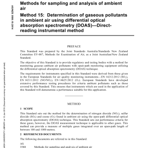 This Standard sets out the method for the determination of nitrogen dioxide (NO2), sulfur dioxide (SO2) and ozone (O3) found in ambient air using the open-path differential optical absorption spectrometry (DOAS) technique. This Standard sets out performance criteria for these gases, however, the DOAS measurement technique is applicable to other gases. This method can provide a measure of multiple gases integrated over an open-path length of between 100 and 1000 metres.