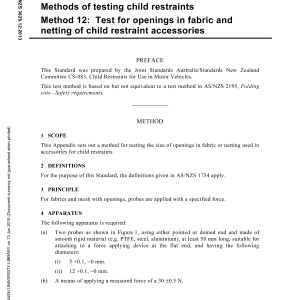 This Standard sets out a method for testing the size of openings in fabric or netting used in accessories for child restraints.