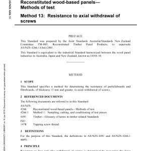 This Standard specifies a method for determining the resistance of particleboards and fibreboards, of thickness 15 mm and greater, to axial withdrawal of screws.