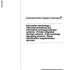 Specifies the signalling protocol for the support of calling and connected name identification supplementary services at the Q reference point between private integrated services network exchanges connected together within a private integrated services network. The Q reference point is defined in AS/NZS 4136.1:1995. It is one of a series of Standards applicable to private integrated services networking. This Standard is identical with and has been reproduced from ISO/IEC 13868:1995.