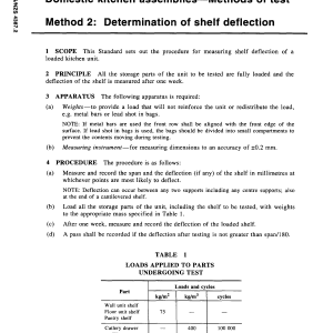 This Standard sets out the procedure for measuring shelf deflection of a loaded kitchen unit.