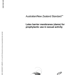 Specifies requirements for latex barrier membranes (dams) for prophylactic use including allowable materials, dimensions, surface finish, taste and smell, thermal stability, packaging and labelling as well as physical properties such as elongation and tear and rupture resistance. These differentiate prophylactic dams from other barrier products such as dental dams, which are not intended for, and may not be suitable for use in, sexual situations.
