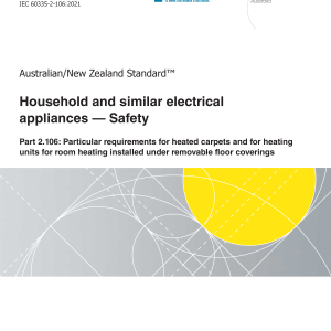 AS/NZS 60335.2.106:2022 deals with the safety of portable heated carpets, heated carpets and similar appliances and heating units to heat the room in which they are located and that are intended to be installed directly under materials used as a removable floor covering such as carpet, cushion vinyl, or loose laid laminate, their rated voltage being not more than 250 V for single-phase installations and 480 V for other installations, including direct current (DC) supplied appliances. This Standard will supersede AS/NZS 60335.2.106:2007 three years from the date of publication (i.e. on 30 June 2026). During this period AS/NZS 60335.2.106:2007 will also remain current. Regulatory authorities that reference this Standard in regulation may apply these requirements at a different time. Users of this Standard should consult with these authorities to confirm their requirements.
