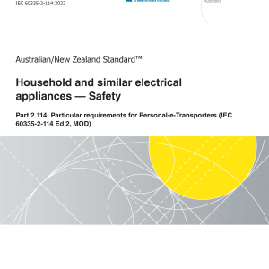 AS/NZS 60335.2.114:2023 deals with the electrical safety of Personal e-Transporters used in the private or public areas. This Standard will supersede AS/NZS 60335.2.114:2018 three years from the date of publication (i.e. on 1 December 2026). During this period AS/NZS 60335.2.114:2018 will also remain current. Regulatory authorities that reference this Standard in regulation may apply these requirements at a different time. Users of this Standard should consult with these authorities to confirm their requirements.