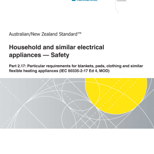 AS/NZS 60335.2.17:2023 deals with the safety of electric blankets, pads, clothing and other flexible appliances that heat the bed or human body, for household and similar purposes, their rated voltage being not more than 250 V including direct current (DC) supplied appliances and battery-operated appliances. This Standard will supersede AS/NZS 60335.2.17:2012 three years from the date of publication (i.e. on 1 December 2026). During this period AS/NZS 60335.2.17:2012 will also remain current. Regulatory authorities that reference this Standard in regulation may apply these requirements at a different time. Users of this Standard should consult with these authorities to confirm their requirements.