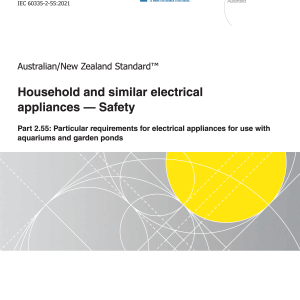 AS/NZS 60335.2.55:2022 deals with the safety of electric appliances for use with aquariums and garden ponds for household and similar purposes, their rated voltage being not more than 250 V, including direct current (DC) supplied appliances and battery-operated appliances. This Standard will supersede AS/NZS 60335.2.55:2011 three years from the date of publication (i.e. on 25 November 2025). During this period AS/NZS 60335.2.55:2011 will also remain current. Regulatory authorities that reference this Standard in regulation may apply these requirements at a different time. Users of this Standard should consult with these authorities to confirm their requirements.