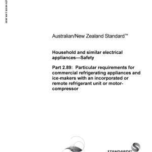 AS/NZS 60335.2.89:2020 specifies safety requirements for electrically operated commercial refrigerating appliances and ice-makers that have an incorporated motor-compressor or that are supplied in two units for assembly as a single appliance in accordance with the instructions (split system). This Standard will supersede AS/NZS 60335.2.89:2010 three years from the date of publication (i.e. on 26 June 2023). During this period AS/NZS 60335.2.89:2010 will also remain current. Regulatory authorities that reference this Standard in regulation may apply these requirements at a different time. Users of this Standard should consult with these authorities to confirm their requirements.