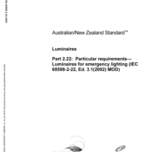 Specifies particular requirements for luminaires for emergency lighting. This Standard is reproduced from IEC 60598-2-22, Ed. 3.1(2002) and modified to suit national conditions. Content history AS 60598.2.22:2019 [Current] IEC 60598-2-22:1997+AMD1:2002 CSV [Superseded] IEC 60598-2-22 ED. 3.1(2002) Please select a variation to view its description. Published 14/12/2005 Pages 22 Please select a variation to view its pdf.