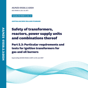 AS/NZS 61558.2.3:2024 deals with the safety of ignition transformers for gas and oil burners. This Standard will supersede AS/NZS 61558.2.3:2011 three years from the date of publication (i.e. on 28 June 2027). During this period AS/NZS 61558.2.3:2011 will also remain current. During this period, it is anticipated that regulatory authorities will approve ignition transformers for gas and oil burners to either standard.