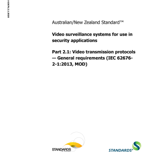 This Standard adopts IEC 62676 2 1:2013 with modifications for Australia and New Zealand, which introduces an IP network interface for devices in surveillance applications. This Standard specifies a network protocol for the full interoperability of video devices. On top of the basic layers protocols are defined to accomplish the full interoperability of video devices. In surveillance applications IP video devices have to use standardized protocols to accomplish following functionality: video streaming, stream control, event handling, discovery, capability description, device management, PTZ control, auxiliaries and other functions.